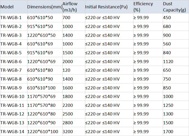 无隔板高效过滤器效率规格: